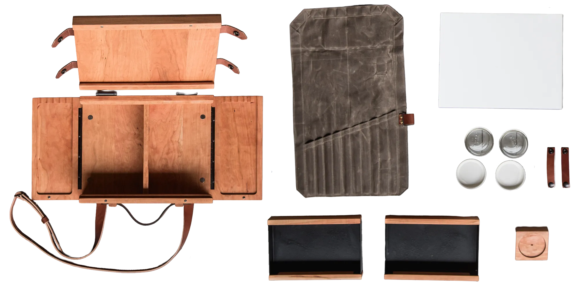 Once opened, the Wyeth transforms into a compact studio designed for 9x12 inch canvases but able to accommodate a canvas up 16x20 inches. The lid attached with sturdy metal torque hinges becomes the easel that can be set to any angle. Two side walls pivot out serving as shelves for holding brushes and jars of brush cleaner or medium. Inside is a 9x12 inch Corian palette, a storage/drying slot for an extra 9x12 inch canvas and two drawers large enough to hold fifteen 37 ml paint tubes and bunch of extra art supplies. The brush roll unfurls, snaps onto the leather shoulder strap and hangs down for easy access. Instead of fumbling with and tripping over multiple bags of supplies and gear, load up the Wyeth pochade box and throw it over your shoulder on your next plein air adventure. It will empower and inspire you to create something awesome!