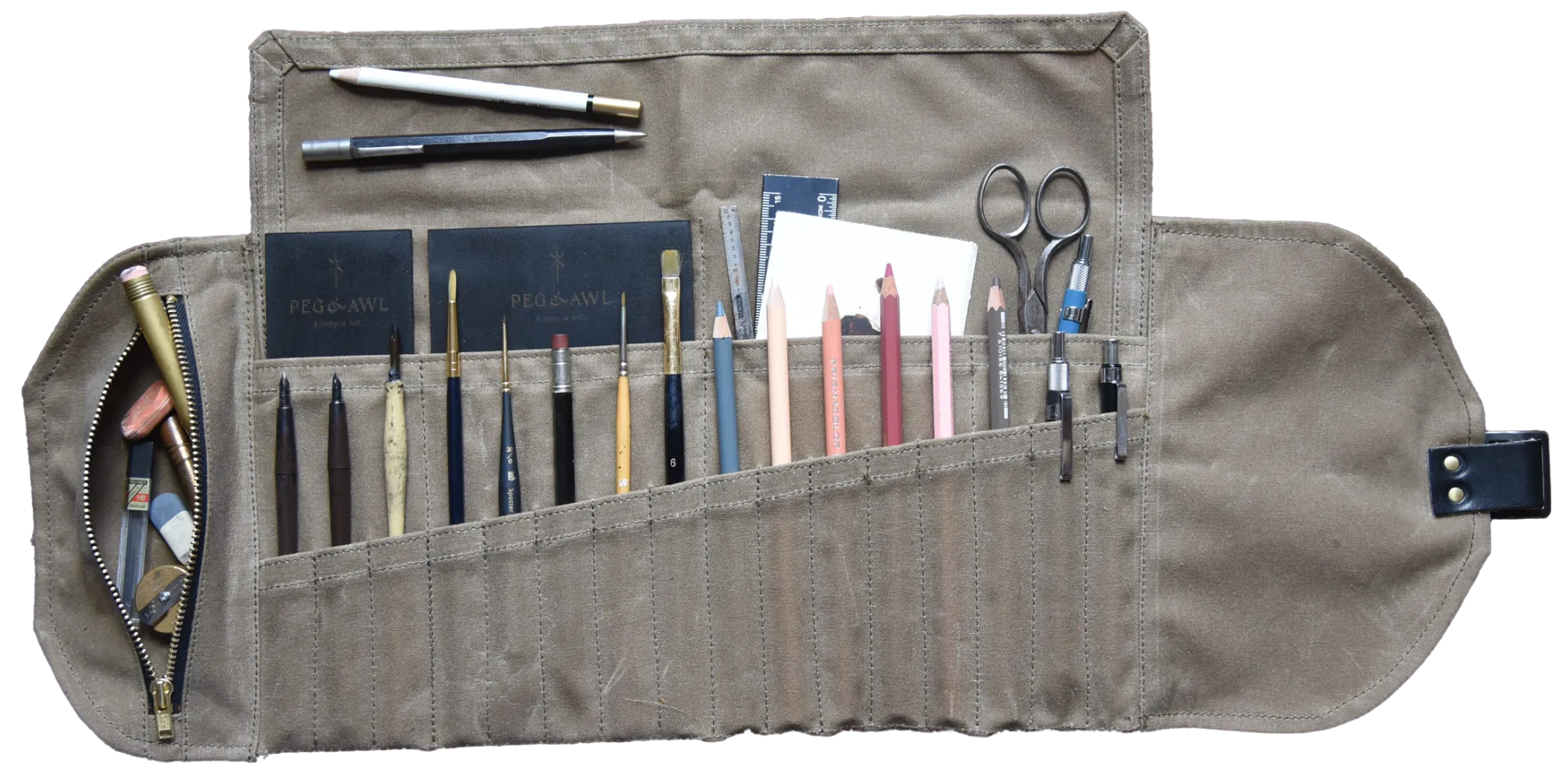 The Sendak Artist Roll is designed with the nomadic artist in mind. This treasure carries your current arsenal of tools with you from the studio to coffee shop to en plein air.